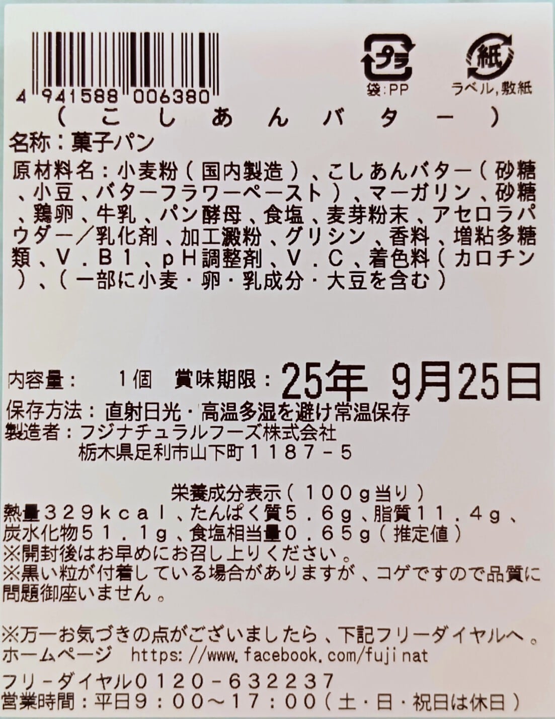 小麦粉(国内製造)、こしあんバター(砂糖、小豆、バターフラワーペースト)、マーガリン、砂糖、鶏卵、牛乳、パン酵母、食塩、麦芽粉末、アセロラパウダー/乳化剤、加工澱粉、グリシン、香料、増粘多糖類、ビタミンB₁、pH調整剤、ビタミンC、着色料(カロチン)、(一部に小麦・卵・乳成分・大豆を含む)