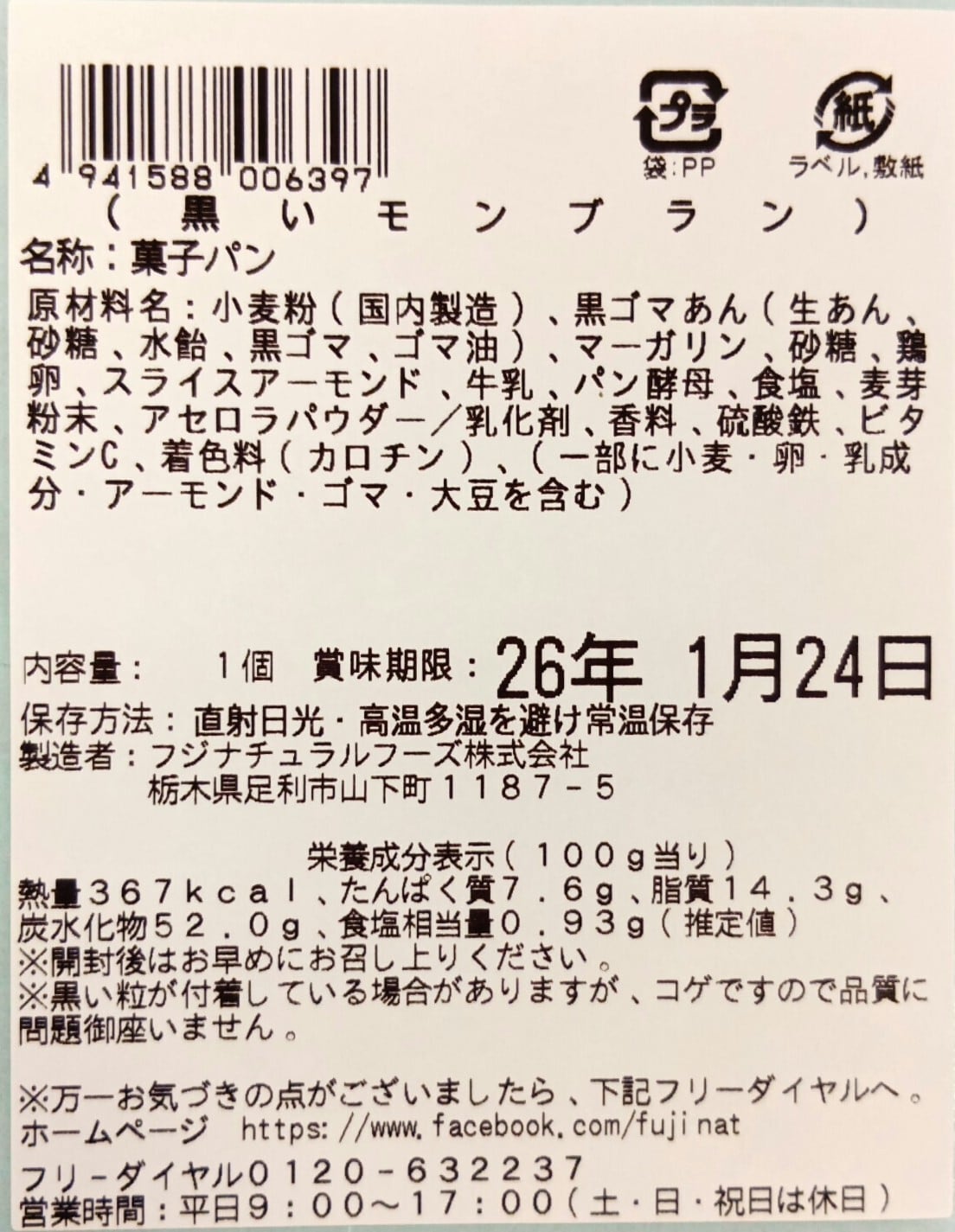 小麦粉(国内製造)、黒ゴマあん(生あん、砂糖、水飴、黒ゴマ、ゴマ油)、マーガリン、砂糖、鶏卵、スライスアーモンド、牛乳、パン酵母、食塩、麦芽粉末、アセロラパウダー/乳化剤、香料、硫酸鉄、ビタミンC、着色料(カロチン)、(一部に小麦・卵・乳成分・アーモンド・ゴマ・大豆を含む)
