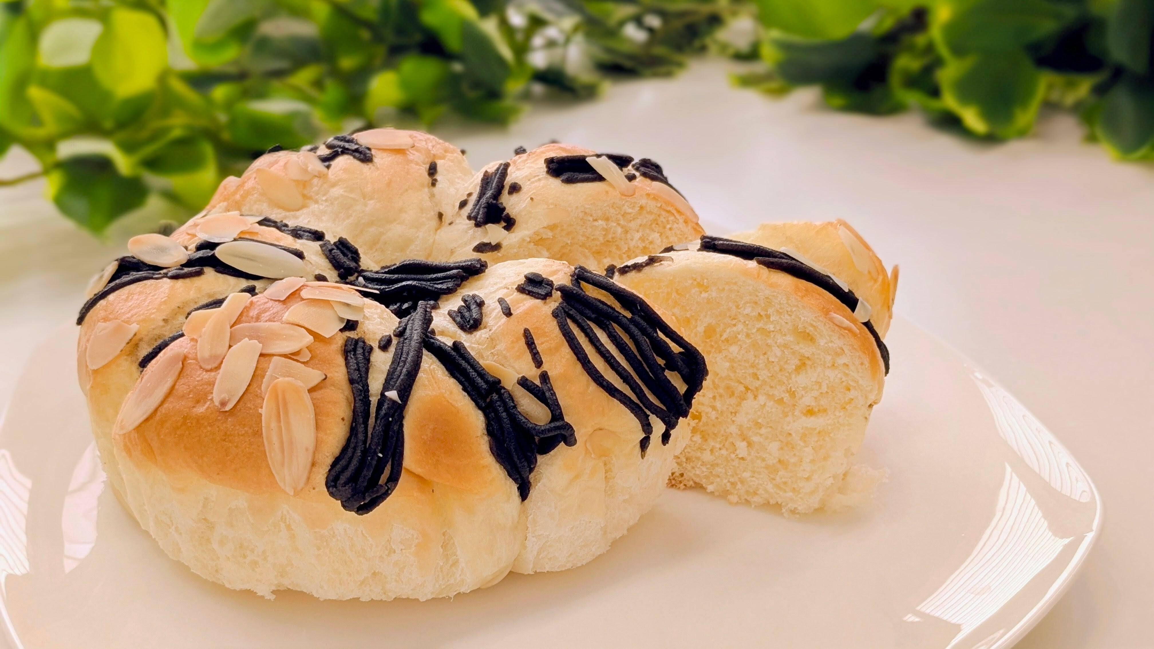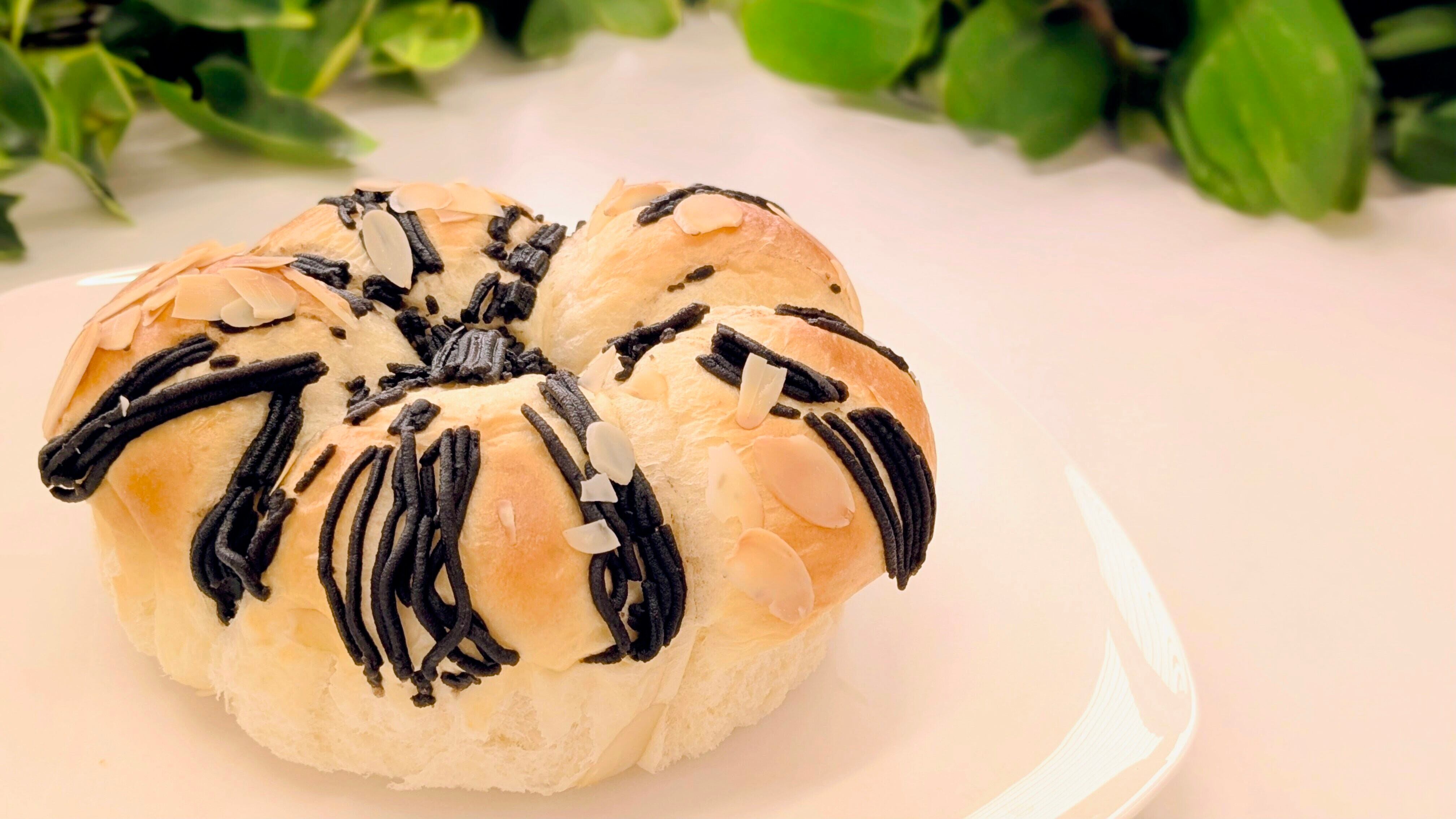 黒ごまあんをトッピングした、モンブラン風のパンです。