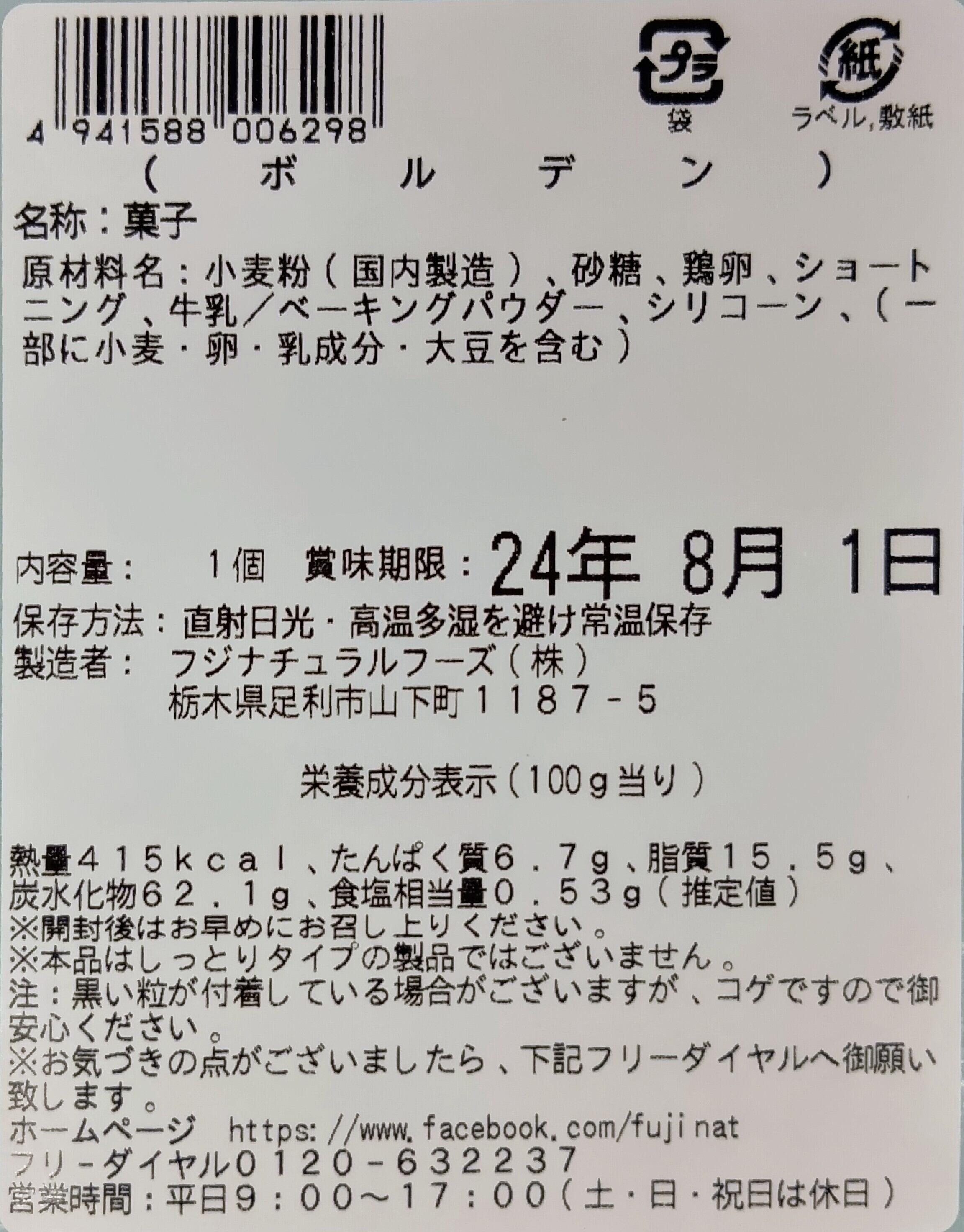 小麦粉(国内製造)、砂糖、鶏卵、ショートニング、牛乳/ベーキングパウダー、シリコーン、(一部に小麦・卵・乳成分・大豆を含む)