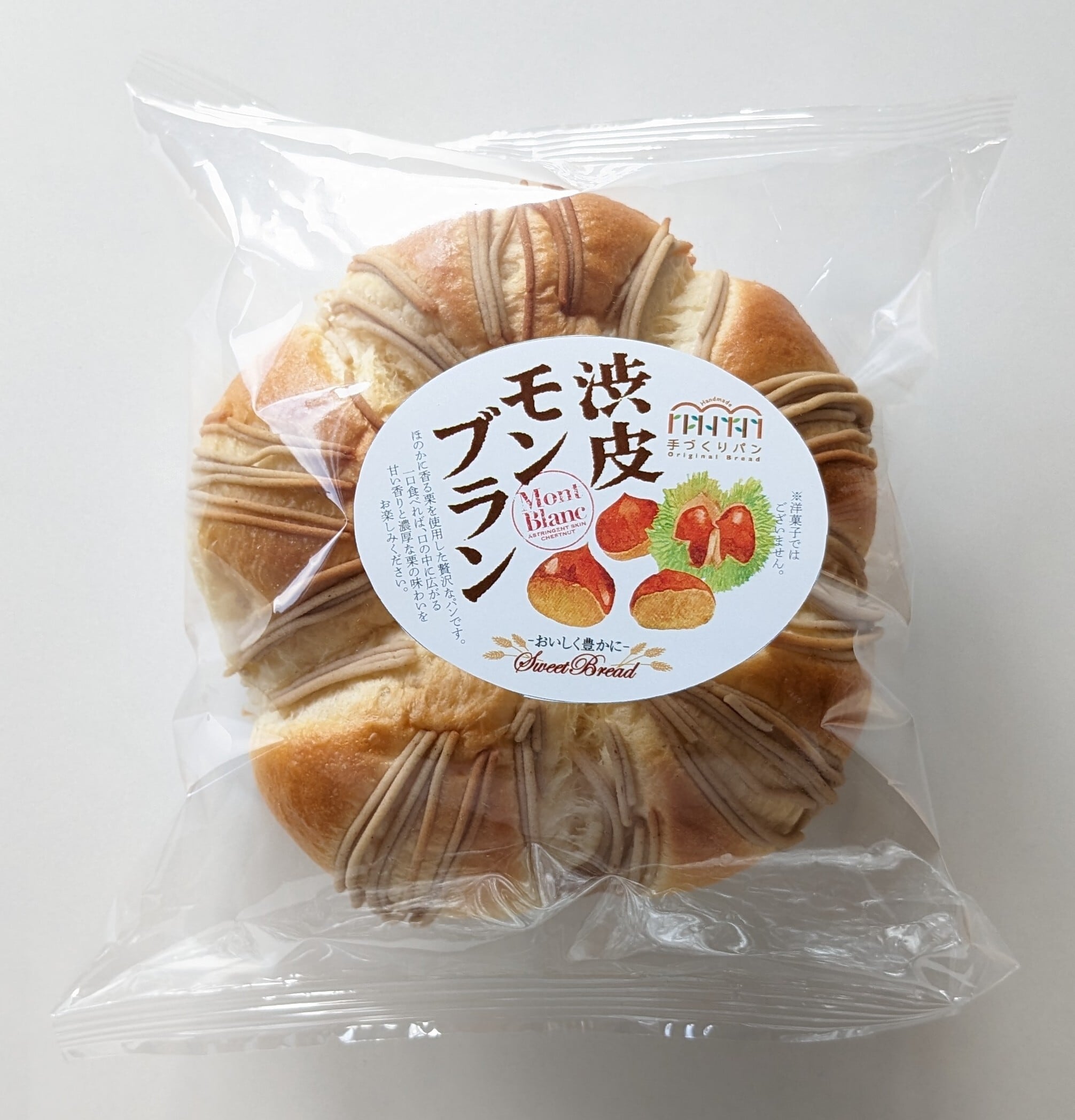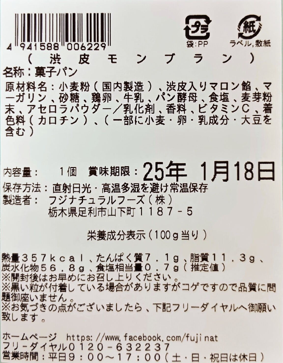小麦粉(国内製造)、渋皮入りマロン餡、砂糖、マーガリン、鶏卵、牛乳、パン酵母、食塩、麦芽粉末、アセロラパウダー/乳化剤、香料、ビタミンC、着色料(カロチン)、(一部に小麦・卵・乳成分・大豆を含む)